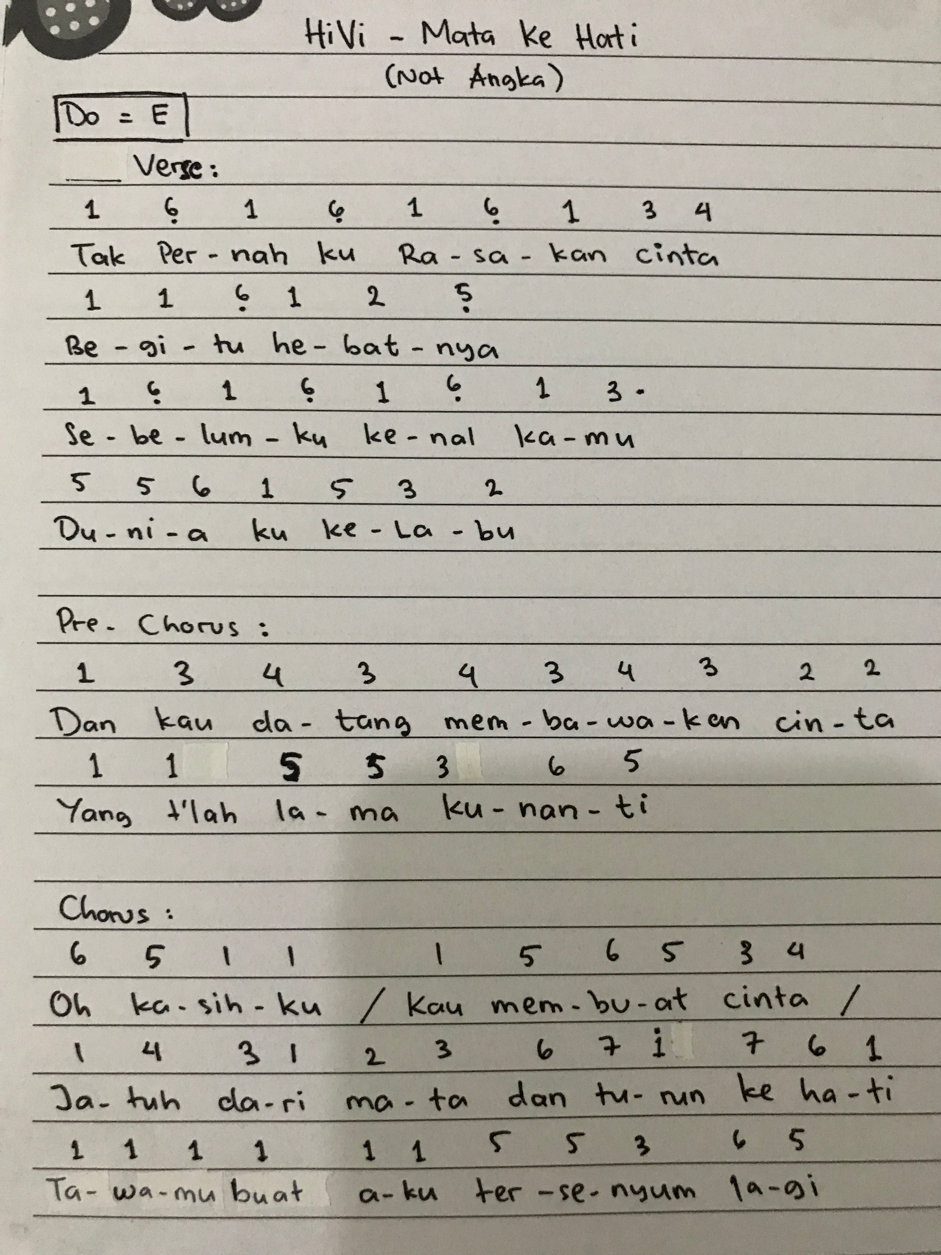 Not dasar lirik lagu : Tanpa chord pengiring musik dan juga not balok. Pencipta lagu cinta dalam hati ini adalah sang gitaris band ungu, yakni oncy. Not angka pianika lagu ungu cinta dalam hati. Jika ada kesalahan pada angka atau nada harap maklum ya!