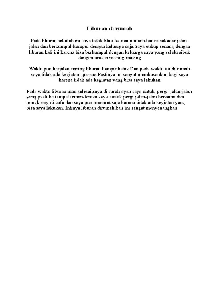 Kali ini kita akan melihat contoh dialog bahasa inggris 4 orang tentang liburan. Nah itu tadi beberapa contoh karangan . Untuk menulis karangan dalam bahasa inggris, yang harus diingat adalah penggunaan past tense. Cerita liburan ke pantai dalam bahasa inggris singkat : Berikut referensi cerita liburan di rumah dalam bahasa inggris singkat dan terjemahannya dalam bahasa indonesia.
